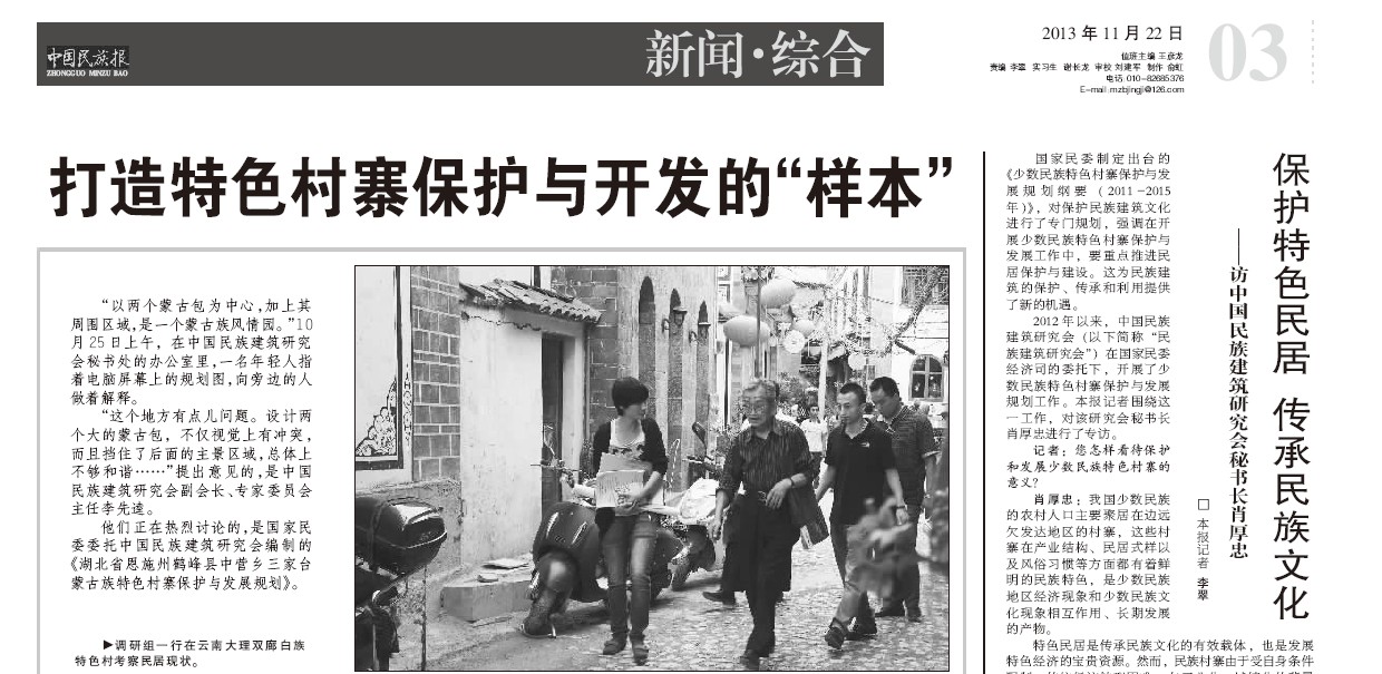 2013年11月22日,《中國民族報》刊登了記者對集團(tuán)董事長肖厚忠的專訪。本次專訪以“保護(hù)特色民居,傳承民族文化”為主題,肖厚忠董事長作為中國民族建筑研究會秘書長圍繞著這一主題一一回答了記者的提問。全文轉(zhuǎn)載如下: