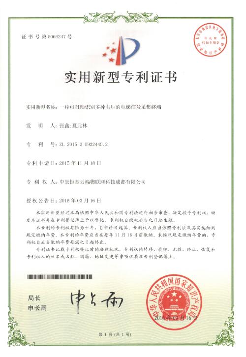 本網(wǎng)訊(通訊員 張鑫)近日,集團(tuán)旗下中景恒基云端物聯(lián)網(wǎng)科技成都有限公司獲得兩項國家知識產(chǎn)權(quán)局頒發(fā)的專利證書,分別是“一種可自動識別多種電壓的電梯信號采集終端”和“一種用于電梯的多功能物聯(lián)網(wǎng)終端”。