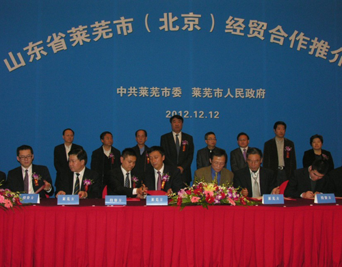 2012年12月12日山東省萊蕪市(北京)經(jīng)貿(mào)合作推介會(huì)在北京香格里拉飯店召開。會(huì)議由萊蕪市副市長丁習(xí)文主持,萊蕪市市委書記劉士合、市長楊宜新等領(lǐng)導(dǎo)及知名投資企業(yè)的領(lǐng)導(dǎo)出席了此次會(huì)議,中景恒基集團(tuán)作為投資方出席會(huì)議。