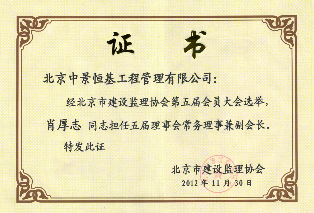 北京市建設(shè)監(jiān)理協(xié)會第五屆會員大會于2012年11月30日上午9時召開,共有180多家會員單位參加了本次大會。經(jīng)與會會員民主選舉,我公司當(dāng)選為北京市建設(shè)監(jiān)理協(xié)會第五屆常務(wù)理事單位。公司總經(jīng)理肖厚志被選為副會長。