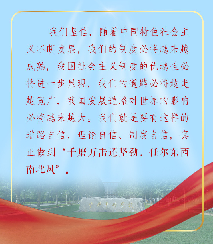 強(qiáng)調(diào)堅(jiān)持和發(fā)展中國(guó)特色社會(huì)主義道路,習(xí)近平引用“風(fēng)景這邊獨(dú)好”;學(xué)習(xí)和借鑒外國(guó)經(jīng)驗(yàn),習(xí)近平提醒千萬(wàn)不能“邯鄲學(xué)步,失其故行”;堅(jiān)持道路自信、理論自信、制度自信,習(xí)近平勉勵(lì)我們真正做到“千磨萬(wàn)擊還堅(jiān)勁,任爾東西南北風(fēng)”。妙語(yǔ)頻出,發(fā)人深省。